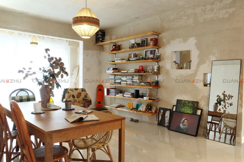 客厅—餐厅—阳台共同构成一个开放式空间,屋主千豆和男友将这个区域打造成了一个兼具生活功能与艺术氛围的多用途空间。这儿既是存放书籍画册、分享摄影作品的互动场所,也是和老友喝咖啡、闲聊的温暖角落,他们一点点将时间的痕迹、生活的热爱,凝结在家的每处细节中。