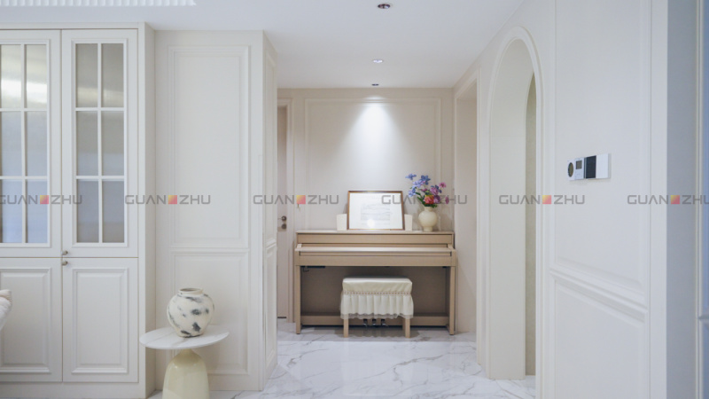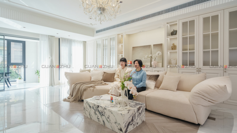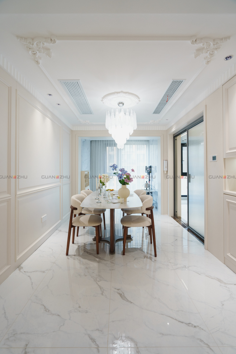 新家的装修精心设计丰富的法式元素——雕花线条、水晶吊灯、大理石纹......硬装和软装的选择都是以“白色”为主,显得干净且看不腻。妈妈周女士将客厅—餐厅—阳台巧妙融合,打造开放式布局设计,空间动线更流畅,也让日常沟通互动更方便。通过云顶国际奶油砖连纹将各区域无缝衔接,延展的纹理让空间视觉更加开阔统一,无论是家人聊天,还是独处放松,这里总能找到舒适角落。
