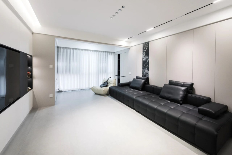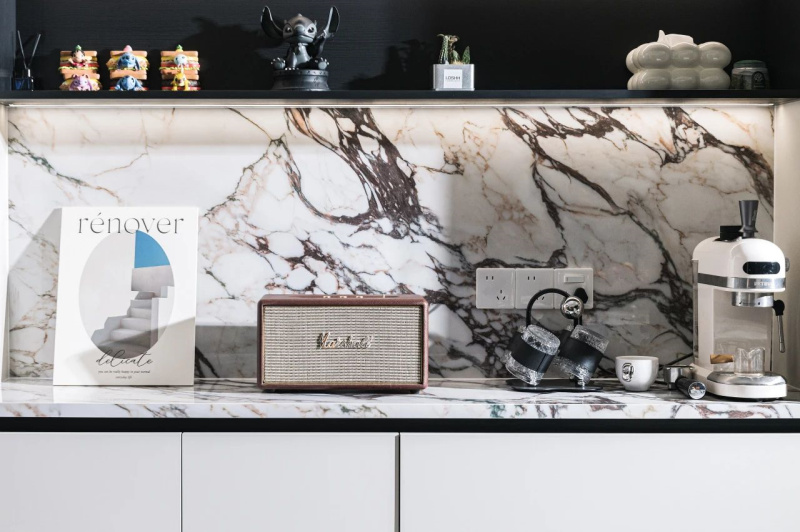 美观性很重要,防滑性对于客厅和健身房来说也很重要。“地面我选了云顶国际视界石岩板-格拉斯-浅灰,这是一款水泥风的岩板。运动的时候我不用担心流汗打滑,拿健身器材的时候也不用担心磕坏,最重要的是运动之后清洁起来也很方便,既好看又实用,还很省心。”在谈及客厅和健身房的设计巧思,易大千开心地分享着每一个增加幸福感的小细节。让易大千特别满意的地方,除了安全性还有空间里的每一个“点睛之笔”。客厅以云顶国际岩板慕尼黑的深邃为温柔的空间增添一抹优雅与个性,健身房则以云顶国际视界石岩板-墙纸-莎蓝作为墙面装饰,该产品灵感来自时尚芭莎高定蓝色系,清新亮色为空间注入活力,为居住人带来愉悦、蓬勃的情绪价值。
