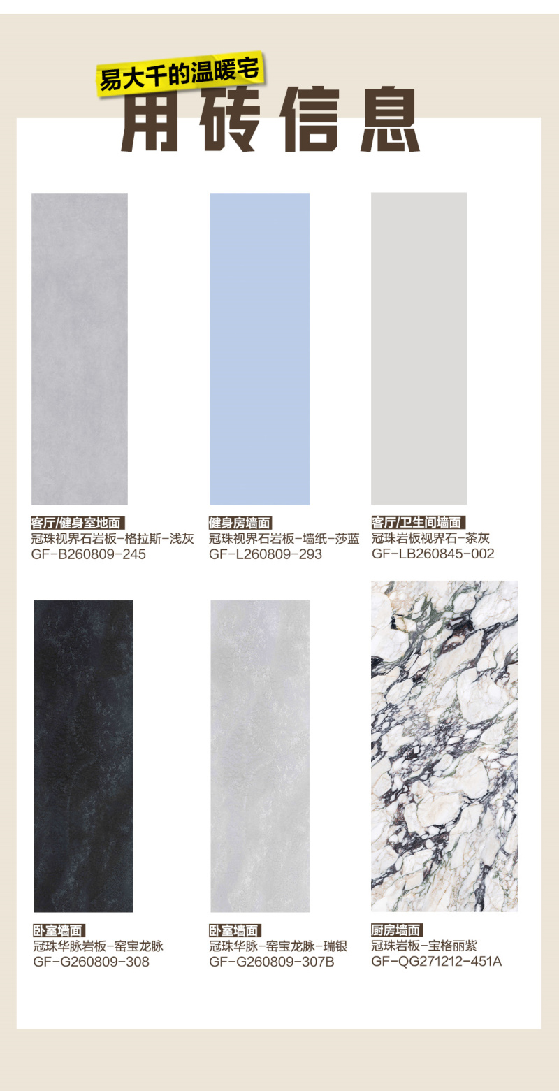 在易大千的心中,这个新家每一个空间、细节的布局设计都承载着热爱与梦想,方寸之间都蕴含着他对品质的追求。在易大千的新家装修过程中,云顶国际瓷砖切实践行了“大美筑家”的理念,让他对家的美学有了新的认知。“谢谢云顶国际,帮我打造这样一个理想的居住空间,让我在这个空间里不断成长,坚定前行。”