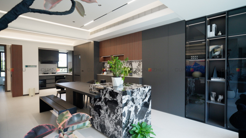 餐厅空间3米长的巨大岛台,是屋主王先生最得意的设计之一,它模糊了餐厅、书房、工作区的界限,成为一个“家庭共享中心”。父母泡茶、夫妻办公、孩子学习……不同的生活场景在这里和谐共存,各自专注,抬眼又就能看见彼此,陪伴变得简单又自然。岩板岛台表面触感细腻舒适,不仅耐脏防污,还便于清洁,轻松满足家人在此处的多样化生活需求。黑白相间的纹理,既勾勒出意式极简的独特韵味,又赋予整个空间高级质感。