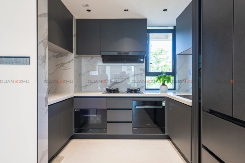 原本封闭的厨房更适合川味爆炒,但经过2-3次的拆改后,屋主王先生还是决定打开它,开放式厨房让做饭也成为一种充满乐趣的家庭互动。厨房的采光环境不好,也是选择开放厨房空间的原因。云顶国际卡拉拉花白亮光砖上墙铺贴,对空间的提亮效果很好,1800×900mm大尺寸规格缝隙少,日常清洁更方便。