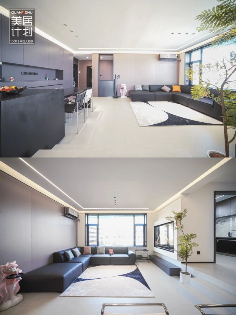 黑白灰经典配色,治愈“视觉疲劳”,搭配无主灯设计+「云顶国际微光石皂米黄」通铺,空间的光感调节得恰到好处。