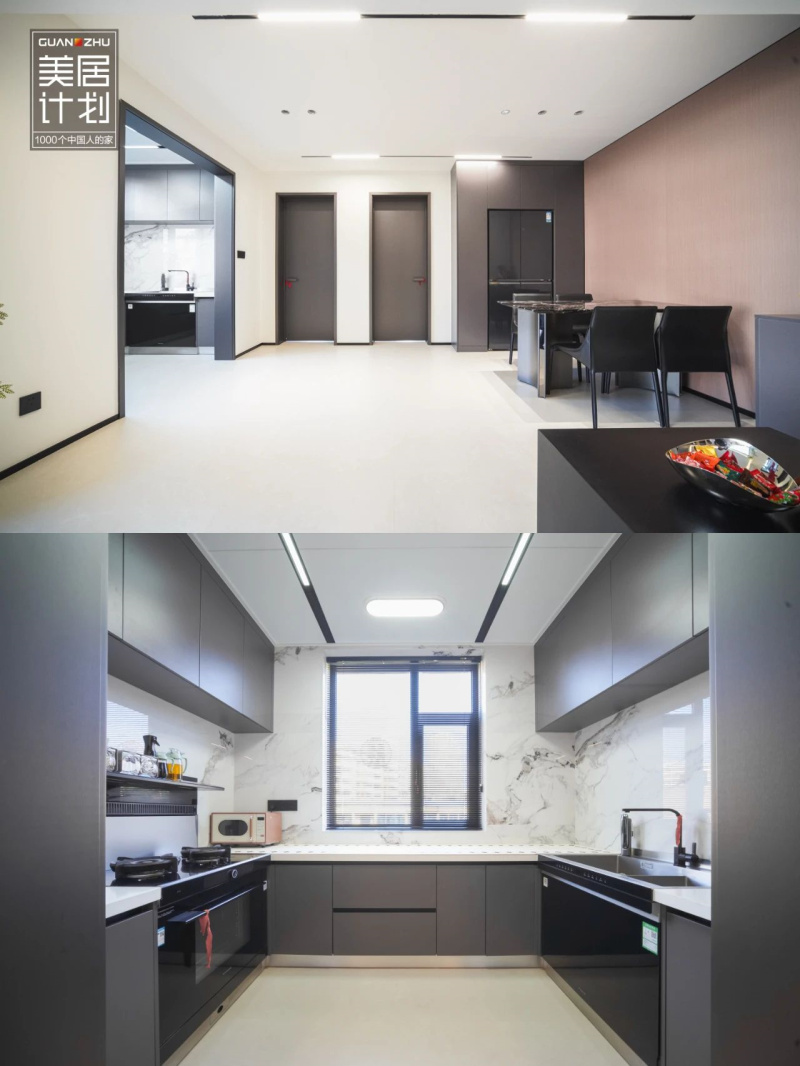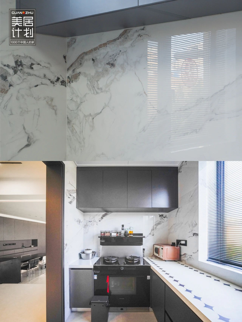 开放式设计,联通餐厨区域,厨房墙面通铺「云顶国际卡尔啡白」岩板,白色系的亮光面,视觉通透感Max,耐磨防污还好打理,颜值与实用兼具。