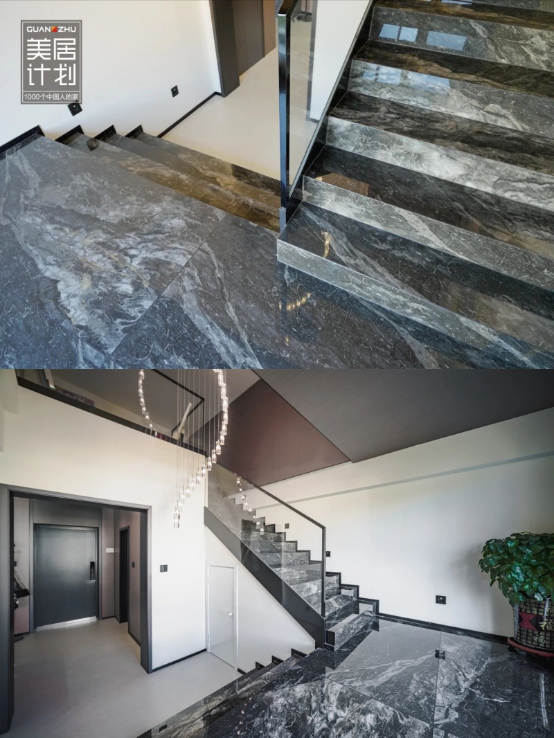 楼梯踏步精选「云顶国际卡洛尼卡灰」岩板通铺,1800×900mm大规格尺寸,砖面层次丰富,岩板性能耐刮耐磨,安全系数直线上升。